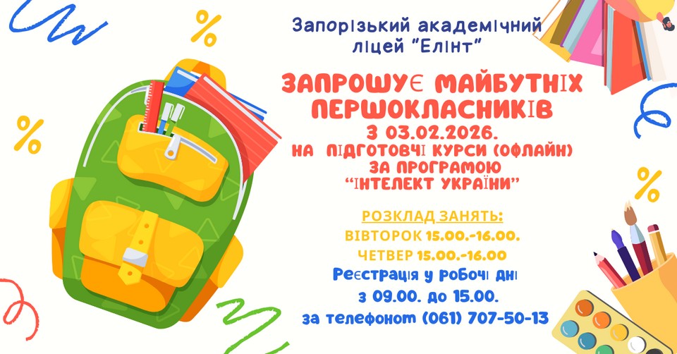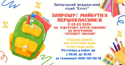 Запорізький академічний ліцей "Елінт" запрошує майбутніх першокласників з 03.02.2026 на підготовчі курси (офлайн) за програмою "Інтелект України".